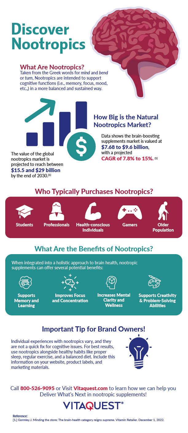 Nutraceutical business owners have been jumping on the nootropics bandwagon. The brain-boosting supplements market is currently valued between $7.68 and $9.6 billion and is projected to grow at a compound annual growth rate (CAGR) of 7.8 percent and 15 percent.[1]